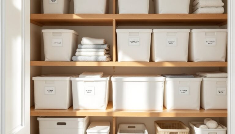 Stack bins vertically only if they’re sturdy enough. Flimsy fabric bins collapse under weight: solid wood-framed or rigid plastic-sided bins stack safely. Label each bin (especially for household items like first-aid supplies or batteries) so family members don’t waste time digging.